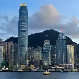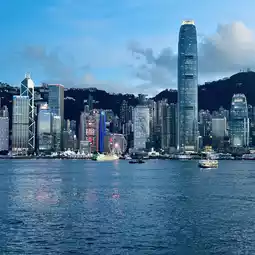 The sun slowly sets in the west, the sky looks like a spilled palette of blue paint, shifting from light blue to deep blue, dyeing the entire Victoria Harbour with a dreamy filter. The glass curtain walls of the skyscrapers reflect warm yellow lights, complementing the blue tones of the sky, fully capturing the vibe of a Hong Kong movie scene 🎞️ On the water, ferries glide slowly by, leaving trails of golden ripples, the shimmering sea surface looks like it's paved with tiny diamonds ✨