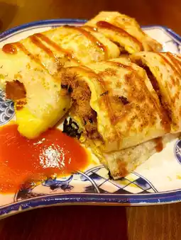 The egg pancake is pan-fried to a crispy perfection, exuding a rich egg aroma. Paired with seaweed, pork floss, and cheese filling, it has a slightly chewy texture!