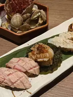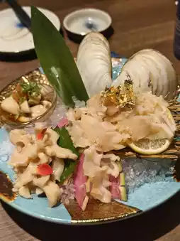 Geoduck tastes fresh and sweet. The geoduck’s throat has a smooth texture, soaked in yuzu juice, giving it a refreshing flavor.