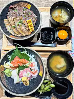 Custom Grilled Meat Donburi $69, with 50g salt-grilled US beef chuck and 50g sauce-grilled Japanese Hokkaido pork belly. The meat is beautifully arranged, with a hint of sesame and green onion aroma. Adding soy sauce and egg makes it even more delicious!