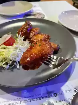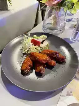 The chicken wings have a slightly charred skin with a strong smoky flavor. The meat is tender, and the barbecue sauce has a bit of spiciness.