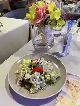 The salad greens are very fresh, and the dressing is different from usual—it’s salty.