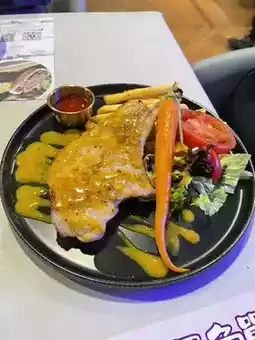 The pork saddle is thick, with a firmer and drier texture. Paired with honey mustard sauce, it has a sweet flavor. The fries are crispy, and the carrots are sweet.
