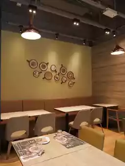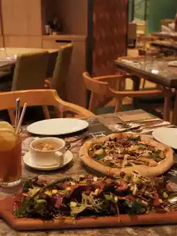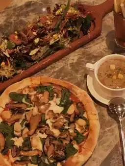 You can see the kitchen has a volcanic stone oven baking thin crust pizzas at high heat—professional!