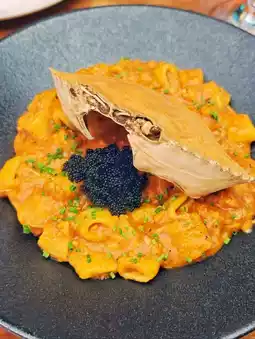 The crab meat-rich shrimp sauce handmade ring pasta🦀🍝 is shaped in cute rings💫, with a chewy texture that holds the sauce well💧. The shrimp sauce🦐 is incredibly rich, packed with lots of fresh sweet crab meat🦀, and topped with plenty of black caviar🖤, delivering an intense burst of umami🌊!