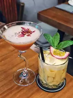 This is a bar restaurant🍷, so they offer a variety of alcoholic drinks🍹. If you want non-alcoholic🥤 options, they have plenty of mocktails too. Just hearing the name Dance Tonight💃 already sets the mood✨! One sip bursts with the fresh aroma of lychee and rose🌹, followed by the slight tartness of red berries and the refreshing lemon🍋, all subtly supported by a tea base. It’s elegant💫 and very refreshing! Tropical Wind really brings tropical🏝️ vibes, with the sweet fragrance of pineapple🍍 and mango🥭 shining through🌟. Passion fruit adds a slight tang💥, and combined with smooth milk🥛, the texture is creamy and silky smooth!