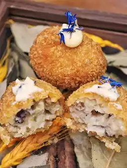 The Iberian ham cream balls are served hot🔥, fried to a golden yellow💛 with a crispy exterior. When you bite in🤤, the inside is ultra-creamy mashed potatoes🥔 filled with plenty of 🇪🇸 Iberian ham🍖 bits! The salty and savory flavor🧂 of the ham fully infuses the creamy filling, making it irresistibly rich🌀!