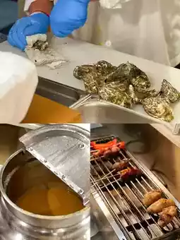 For oysters, the chef shucks fresh live oysters on the spot, which are tender with crispy edges and a strong seawater flavor.
