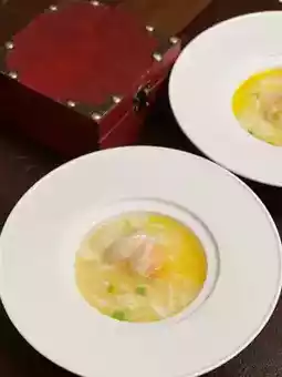 The fish paste soup is dense and smooth, with a strong fish aroma without any fishy smell, enriched with the gelatinous texture of fish maw and translucent, elastic sea cucumber slices.