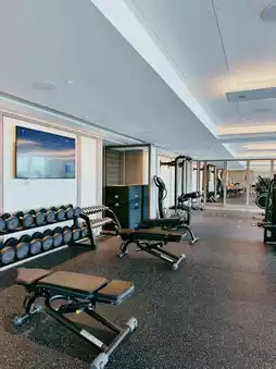 The gym in the morning is not crowded, the equipment is new, and exercising while looking at the sea is refreshing for both body and mind🏋