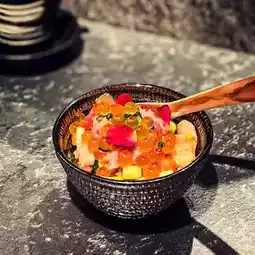 There are tuna puree, salmon roe and a variety of diced sashimi, plus cucumber pieces and edible petals.