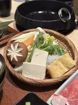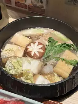 Each set includes an appetizer, assorted vegetables, Ran-Oh egg, Japanese rice or Sanuki udon, and dessert, quite generous! The assorted vegetables include shiitake mushrooms, tofu, tofu skin, green onions, baby bok choy, and taro threads, with many options to add to the sukiyaki sauce or kelp broth according to your preference. This time I chose Sanuki udon, which absorbed the sukiyaki broth very well and was delicious with a chewy texture! The dessert includes two pieces of warabi mochi, chewy and tasty.