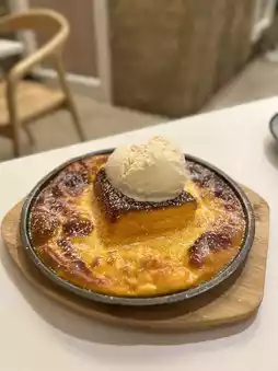 This is a very filling dessert, with a layer of sweet baked egg underneath. The honey toast is soaked in egg mixture and baked together🍞 Topped with sea salt ice cream, the salty and sweet flavors complement each other perfectly🥚