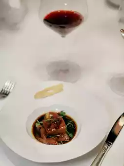 the deep flavor of the braising sauce unfolds on the palate.