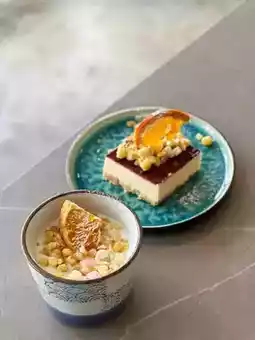 Today's dessert is blueberry cheesecake, dense and delicate with a rich cheese flavor. The sweet and sour blueberry sauce balances the richness, and crispy flakes add texture.