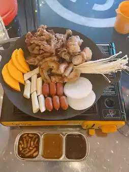 Unlimited Korean beef sausage🐄 add-on $99💰 includes Korean beef slices🥩 grilled beef sausage🐂 sausage, rice cakes, enoki mushrooms🍄🟫 onions🧅 pumpkin🎃 dipped in 3 different sauces to help cut the richness☺️