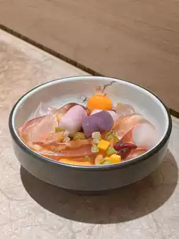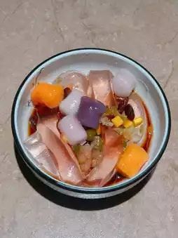 Brown Sugar Ice Jelly🥣 à la carte $28💰 The ice jelly sparkles✨ The sweet brown sugar pairs perfectly with the smooth jelly👍🏻 Also includes taro balls, sweet beans🫘 raisins🍇 and dried pineapple🍍 refreshing and tasty😋