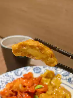 Two-Color Wheat Gluten🥢 à la carte $78💰 Comes in curry vegetarian and sweet and sour vegetarian flavors💛🧡 The wheat gluten has a chewy texture😆 and is very flavorful😗 but is a bit too cold for my liking🥺