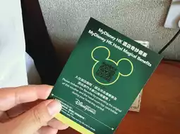 Check-in is on the 3rd floor, and you can store your luggage in advance without any problem. When you get your room card, you'll receive a green "Hotel Special Offer Card" that lets you enjoy discounts: HKD 50 off when you spend HKD 500 at the park or hotel shops, HKD 50 off dining over HKD 500, plus a small gift (we got a luggage tag) 🎁