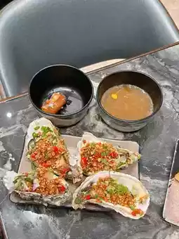Grilled items🔥 set includes💰 Sichuan grilled jumbo fresh oysters🦪 grilled durian, grilled greenhouse sweet pineapple🍍 butter grilled zucchini🧈 grilled seven-flavor dried cod🐟 pineapple and zucchini are very juicy😋 jumbo fresh oysters are huge😍 with fried garlic and chili🧄 super flavorful👍🏻