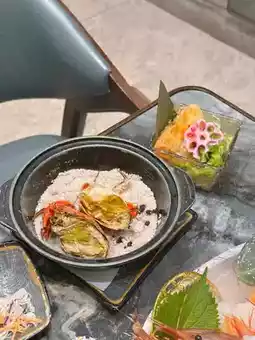 Signature dishes🥢 set includes💰 avocado crab meat monaka🥑 legendary teppan foie gras toast🪿 Thai spicy butter shrimp🇹🇭 fish maw sea cucumber scallop shark fin soup, braised abalone with shiitake mushrooms🍄🟫 oil and salt baked baby crab🦀 sea urchin toro black truffle scallop, huadiao wine drunken abalone🥃 braised abalone giant and chewy😱 baby crab full of crab paste😍 retains the fresh taste of crab meat with salty aroma🤤