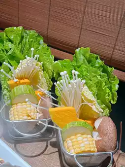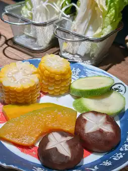 The vegetable platter offers a variety of choices including lettuce 🥬, baby bok choy, shiitake mushrooms 🍄🟫, enoki mushrooms, corn 🌽, zucchini, and pumpkin. The vegetables are fresh and taste sweet after steaming.