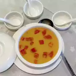 Each of us ordered a slow-cooked scallop in rice soup. The scallops were gently cooked in the rice broth, making them tender and sweet, with a rich rice aroma. A little bit of Jinhua ham was added to make the flavor even more complex.