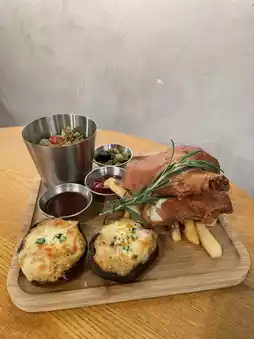 All-day hot food: two hot dishes (such as vegetarian curry + creamy chicken), rice, pasta (with meat sauce or salad), corn or potatoes, soup, spring rolls (these spring rolls are really good).