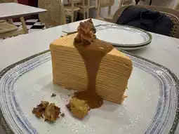 Recently, I’ve been under a lot of work pressure and needed some desserts to relieve stress. I originally planned to choose one, but ended up ordering both. The first was the Thai Tea Mille Crepe Cake ($65). The mille crepe cake was well made, with thin crepe layers sandwiching smooth cream, not too sweet or greasy. Drizzled with Thai tea sauce, it enhanced the tea flavor, paired with crispy caramel crunch, adding more texture and flavor layers.