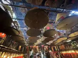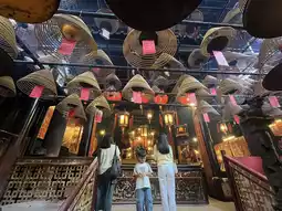As soon as you step inside the hall, your eyes are drawn to the huge spiral incense coils hanging from the ceiling. The smoke rising slowly from the burning incense fills the hall, creating a solemn ambiance. The sight of people praying surrounded by the incense smoke leaves a strong impression, allowing you to deeply feel the unique faith culture of Hong Kong.