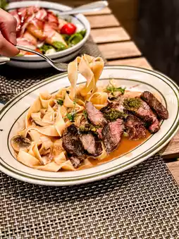 𓆠 Pan-Seared Sirloin with Porcini Mushroom Sauce and Wide Noodles $228
