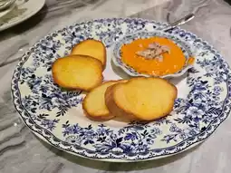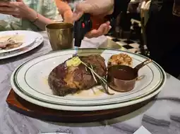 Having read reviews before, I found the restaurant very beautiful, but seeing it in person is even more impressive. The flowers in this color tone are truly endlessly charming, and the decor and colors complement each other beautifully, making dining an enjoyable experience. The menu offers à la carte options as well as two-person sets. I ordered the flaming steak set, which includes the soup of the day, salad, risotto or pasta, and two drinks. The Cognac flaming ribeye steak was impressive. The staff poured the wine and then lit it on fire, which was quite a spectacle. The steak was cooked to medium-well, with a slight char from the flame, a thick texture, juicy with every bite, tender and flavorful.
