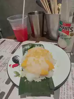 The mango 🥭 was very sweet and paired perfectly with the soft and chewy sticky rice. Adding coconut milk and crispy bits made it even better. It would be perfect with a bit more crunch.