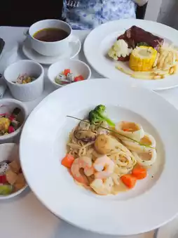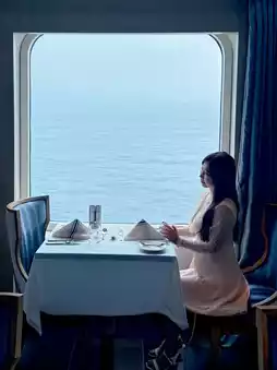 The cruise fare includes 3 complimentary restaurants with one meal each for breakfast, lunch, and dinner daily: Polaris (Chinese), Sophia (Western), and Lido (buffet) – all with stunning sea views 🫶🏻 so blessed ❤️ Sitting by the window for photos was super pretty 😋 Especially loved Sophia – ate there 3 times 🥗 with an appetizer salad bar – dishes could be reordered – even had 2 mains in a row 🤪 super full~
