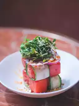 The presentation is vibrant, with neatly cubed watermelon paired with chili oil and crushed peanuts for added texture. The taste starts sweet and ends with a spicy kick. The crisp, juicy watermelon combined with the spiciness is very appetizing.