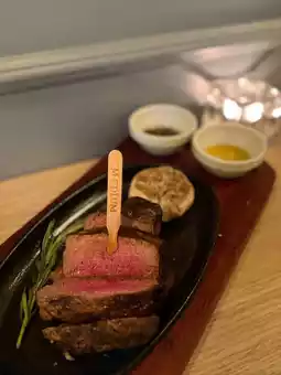 I chose the beef fillet cooked medium. It was served sizzling on a hot plate, and the slices were already pink and juicy. The meat was so tender it melted in my mouth ๐ The beef flavor was strong, the mustard sauce added a spicy kick that enhanced the taste, and the Argentine sauce was tangy and refreshing, cutting through the richness perfectly. Both sauces paired perfectly with the beef ๐๐ป There was also a whole roasted garlic as a side, which smelled amazing!