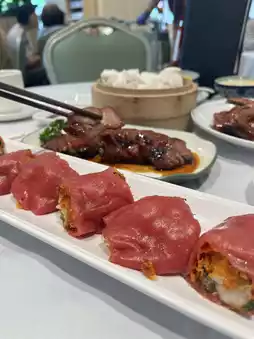 These eye-catching red rice rolls are filled with crunchy shrimp and crispy ingredients, offering a rich texture.