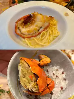 Lobster baked with cheese on E-fu noodles in superior broth, salted baked hairy crab,