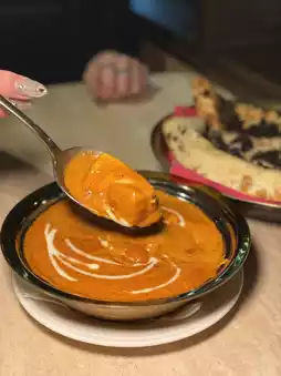 Fresh tomatoes are slow-cooked until caramelized, then combined with cheese and various spices like fenugreek and Indian cardamom. The sauce is creamy and rich, perfectly matched with soft Indian naan bread!