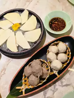 Fish balls are snow-white and bouncy, beef balls have a firm texture and are full of meat juice.