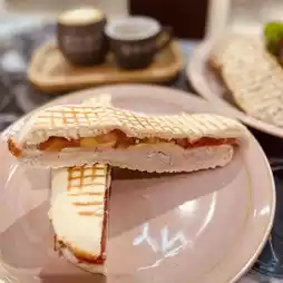 Toasted crisp pasta with tender turkey breast, tomatoes, shredded cheese, a simple and delicious sandwich, served with coffee is a happy noon