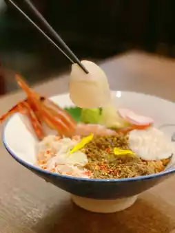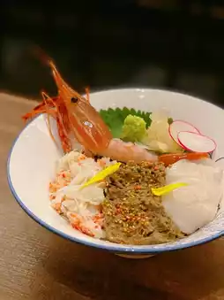 This rice bowl looks very colorful, with crab paste, crab meat, peony shrimp and sashimi. There is a lot of crab meat, and the delicious crab paste is perfect for eating with rice. There are three big scallops, and they are thick and fresh! The peony shrimp are big and bouncy. The rice bowl is not ordinary white rice, it has been seasoned.
