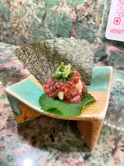 Soy-marinated bonito innards paired with cream cheese, wrapped in crispy seaweed, rich in flavor and perfect with alcohol.