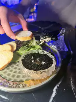 Sweet and bouncy crab meat topped with black caviar, paired with crispy toast, highlighting the savory freshness of the seafood.