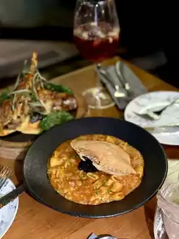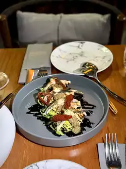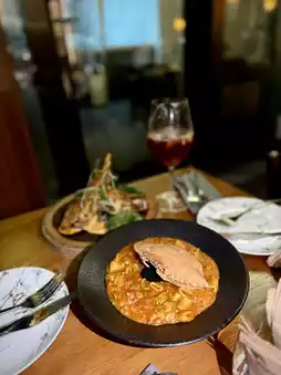 Cold tapas (fresh salad greens π₯ paired with Italian sun-dried tomatoes and balsamic olive oil); Hot tapas octopus π with a chewy texture; potato omelet rich in flavor; main course grilled lamb rack π, each bite tender with a hint of gaminess, served with green peppers, mushrooms, and creamy mashed potatoes, very satisfying; ring-shaped pasta rarely eaten on regular days, each piece accompanied by fresh crab meat π¦, flavors well blended.