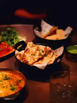 The naan is thin and crispy with a hint of garlic aroma.