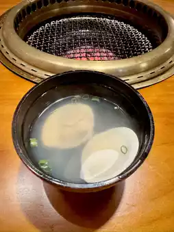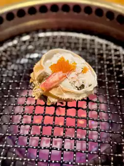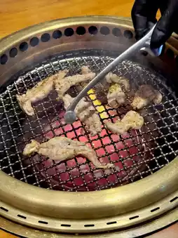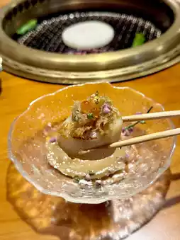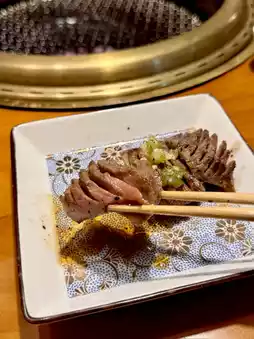 Grilled whole netted beef tongue was crispy and chewy, served with three different sauces: garlic sauce, green pepper sauce, and fruity yakiniku sauce, making it hard to stop eating!