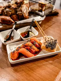 These are small, perfect bar snacks. The fried shrimp toast is fragrant and tasty with fresh, bouncy shrimp; the quail eggs burst with egg aroma, pairing well with the rice koji scent of makgeolli; the soft rice cake complements the savory sausage, making it irresistible.