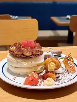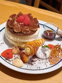 This dessert already makes you happy just by looking at it💞. The two layers of soufflé pancakes are super fluffy with a rich egg flavor. On top, there’s tiramisu cream and some chocolate crunch between the cream and pancakes, which is definitely the icing on the cake❣️. There’s also a cream cone with a very crispy texture.