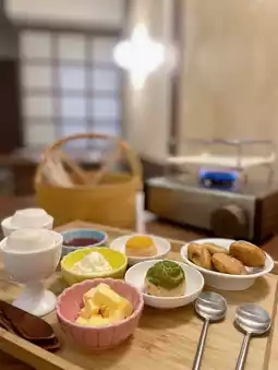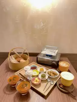 (French creme bread, shortbread strips, pastry bread, jam and whipped cream, mixed broth, selected savory and sweet snacks, maple cinnamon coffee, honey milk)